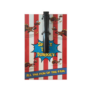 The object of the game is simple, the stall holder holds the turkey by the tail of the top tube and then drops it. The participant tries to hit the turkey with the bat as it comes out of the bottom tube to win! Test your hand eye coordination against your family and friends see who is the champion at this great side stall challenge.