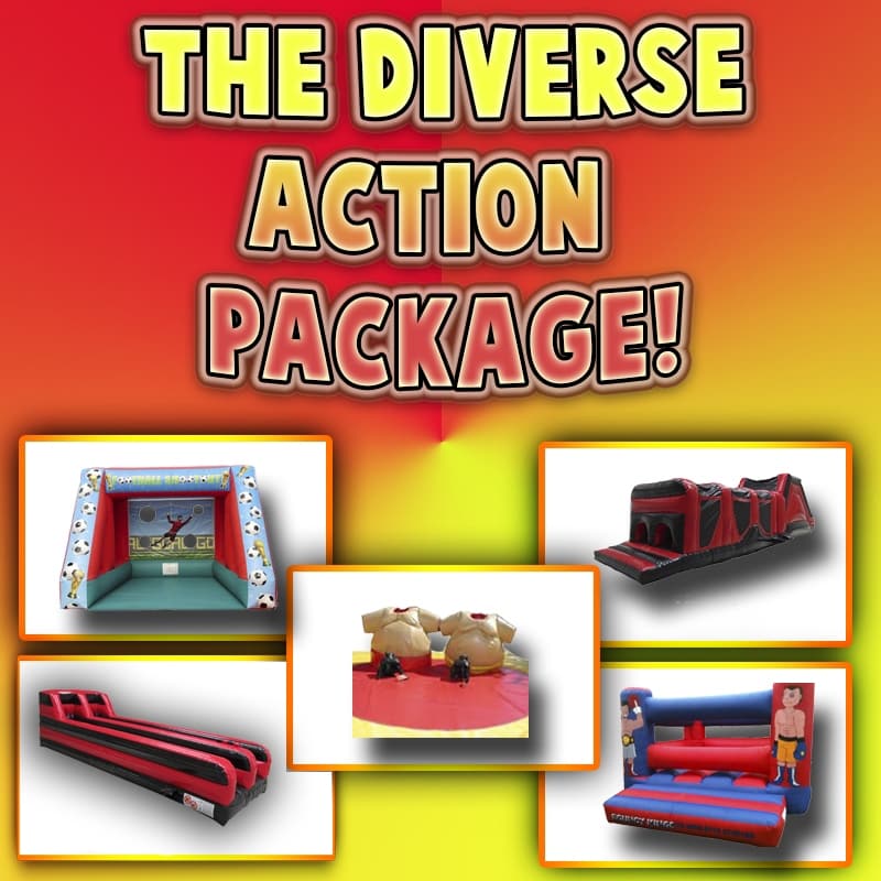 The diverse action package is now here and available to hire! It brings together 5 different inflatables that challenge different skills and mind sets for the user. This particular package includes the Penalty Shootout, 2 Part Assult Course, Sumo Suits, Bungee Run and Bouncing Boxing.